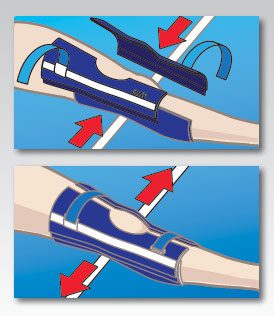 The device principle is simple. By immobilizing the knee and precluding both flexion (by means of the HEMobilizer® ‘stays’) as well as medial and lateral motion (by means of the straps) significant motion at the catheterization site is eliminated.