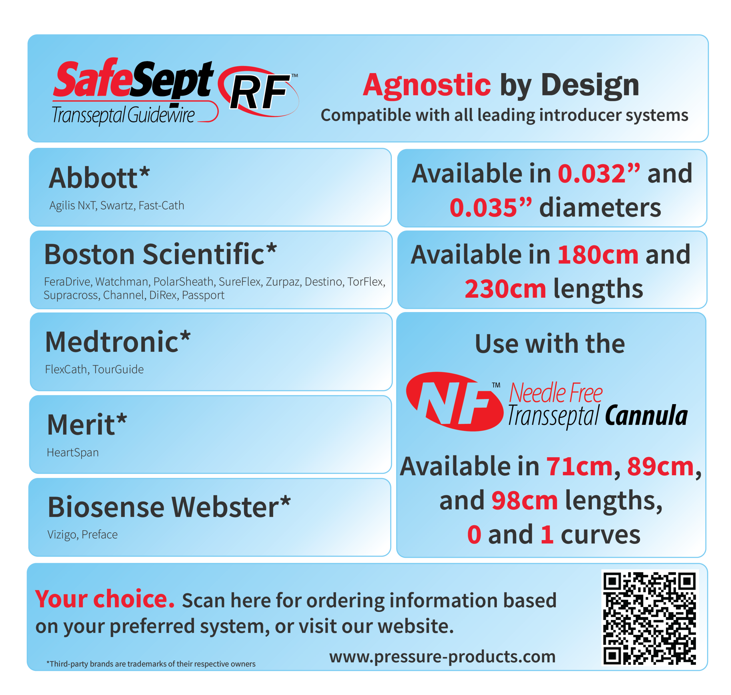 The SSRF™ is available in both a retention and J-curve configuration in 0.032 and 0.035 inch diameters, making it agnostic by design. It can be paired with the optional Needle-Free Transseptal Cannula™, available in 71, 89, and 98 centimeter lengths in Curve 0 and Curve 1, enabling compatibility across a broad range of transseptal access workflows.